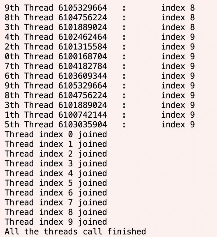 모든 스레드 동작이 끝나면 (0 ~ 9번 스레드가 index 9까지 전부 출력했을 경우) main문의 남은 줄이 실행된다
