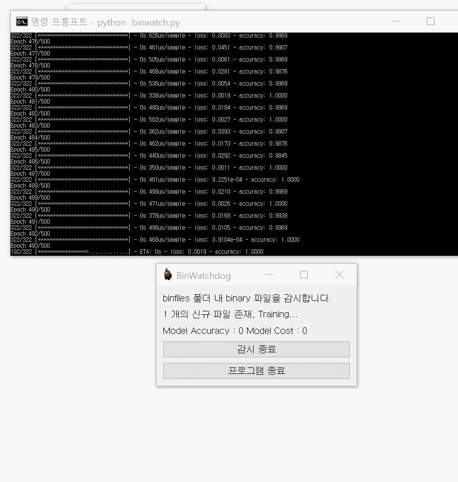 그리고 마지막 에포크의 cost랑 Accuracy를 각각 넘겨주고 모델 h5파일 저장후 binwatch.py로 돌아옴