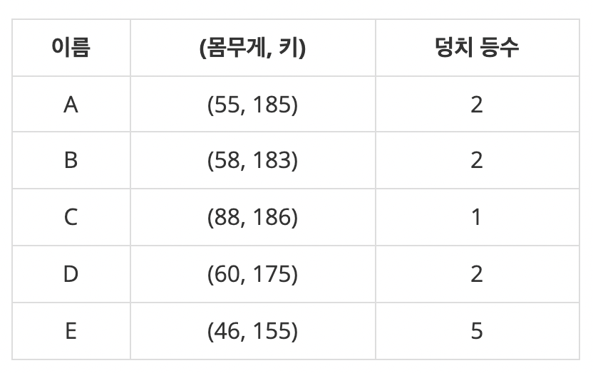 N명의 집단에서 각 사람의 덩치 등수는 자신보다 더 "큰 덩치"의 사람의 수로 정해진다. 만일 자신보다 더 큰 덩치의 사람이 k명이라면 그 사람의 덩치 등수는 k+1이 된다. 이렇게 등수를 결정하면 같은 덩치 등수를 가진 사람은 여러 명도 가능하다. 아래는 5명으로 이루어진 집단에서 각 사람의 덩치와 그 등수가 표시된 표이다.