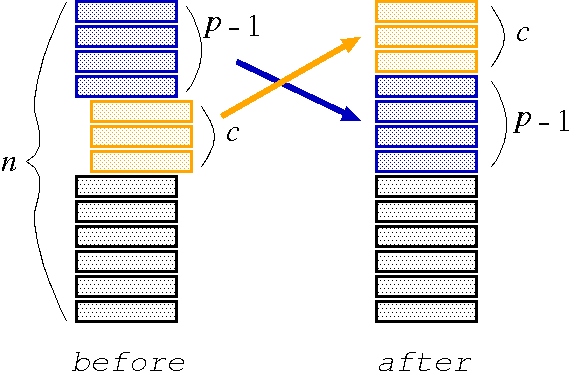 There is a deck of n cards. Starting from the p-th card from the top of the deck, c cards are pulled out and put on the top of the deck, as shown in Figure 1. This operation, called a cutting operation, is repeated.