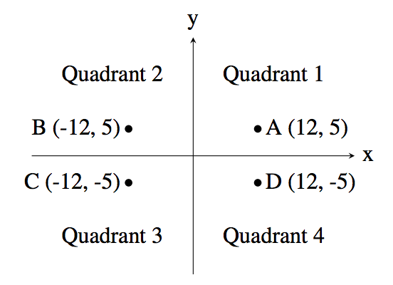 예를 들어, 좌표가 (12, 5)인 점 A는 x좌표와 y좌표가 모두 양수이므로 제1사분면에 속한다. 점 B는 x좌표가 음수이고 y좌표가 양수이므로 제2사분면에 속한다.