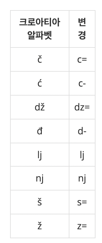 예전에는 운영체제에서 크로아티아 알파벳을 입력할 수가 없었다. 따라서, 다음과 같이 크로아티아 알파벳을 변경해서 입력했다.