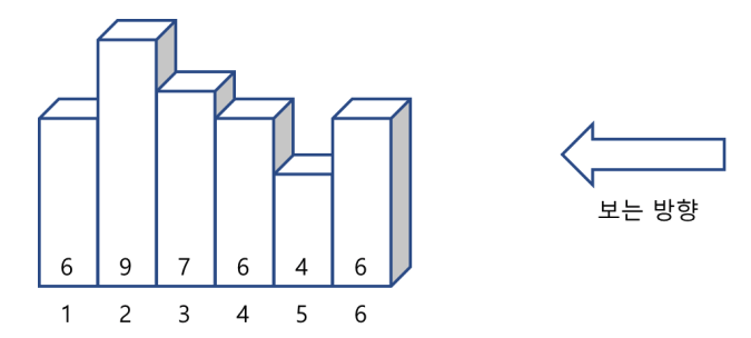 아래 그림처럼 높이만 다르고 (같은 높이의 막대기가 있을 수 있음) 모양이 같은 막대기를 일렬로 세운 후, 왼쪽부터 차례로 번호를 붙인다. 각 막대기의 높이는 그림에서 보인 것처럼 순서대로 6, 9, 7, 6, 4, 6 이다. 일렬로 세워진 막대기를 오른쪽에서 보면 보이는 막대기가 있고 보이지 않는 막대기가 있다. 즉, 지금 보이는 막대기보다 뒤에 있고 높이가 높은 것이 보이게 된다. 예를 들어, 그림과 같은 경우엔 3개(6번, 3번, 2번)의 막대기가 보인다.