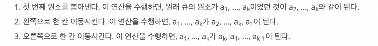 deq.pushFront(deq.popBack()); - 덱의 중앙보다 앞쪽에 있을 경우 뽑으려는 원소가 맨 앞에 올 때까지 왼쪽으로 이동 (맨 앞의 원소를 맨 뒤로 보내기 ⇒