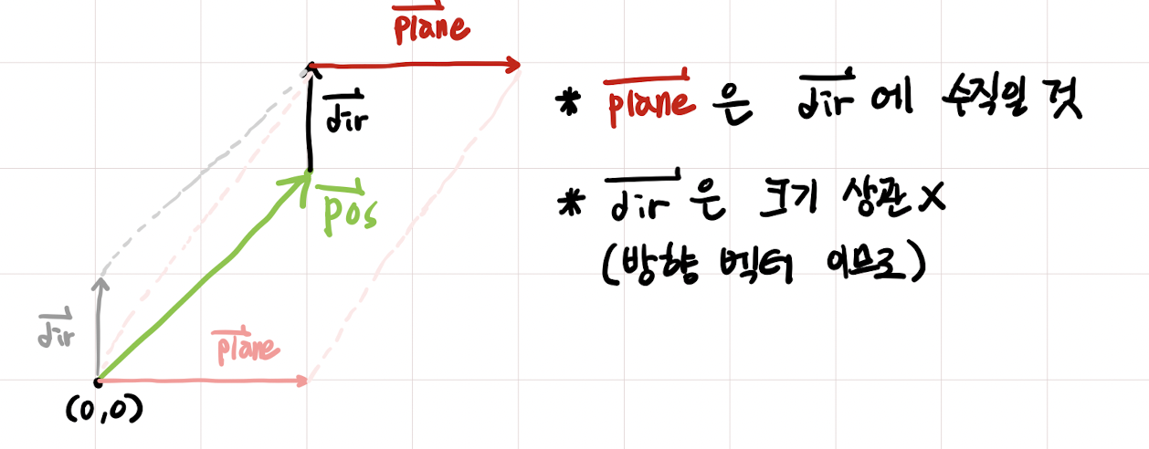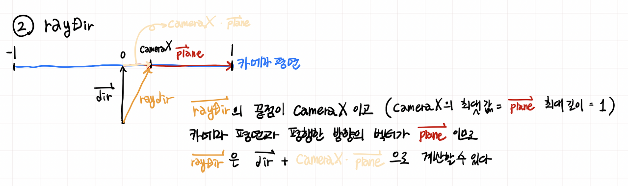 • 위에서 설명한 벡터의 합을 이용하여 rayDir을 구할 수 있다 (dir + plane*가중치)