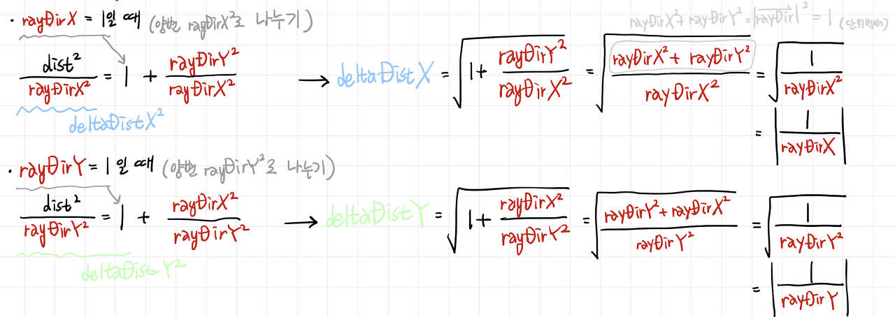 • deltaDistX: n - 1번째 x면을 만나는 점부터 에서 n번째 x면과 만나는 점까지 광선의 이동 거리