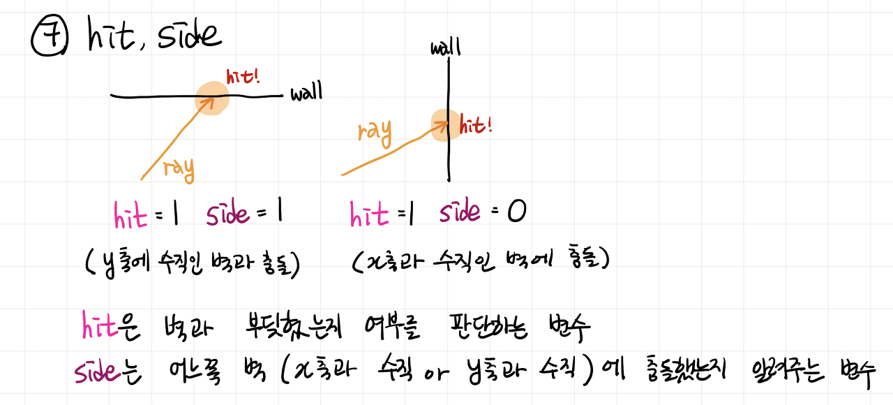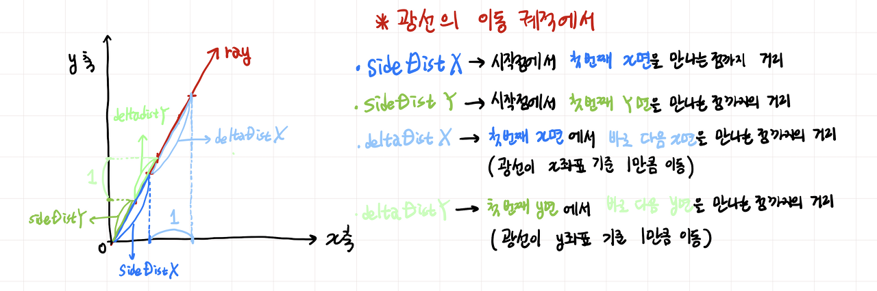 • sideDistXsideDistY는 광선이 이동하면서 계속 갱신된다