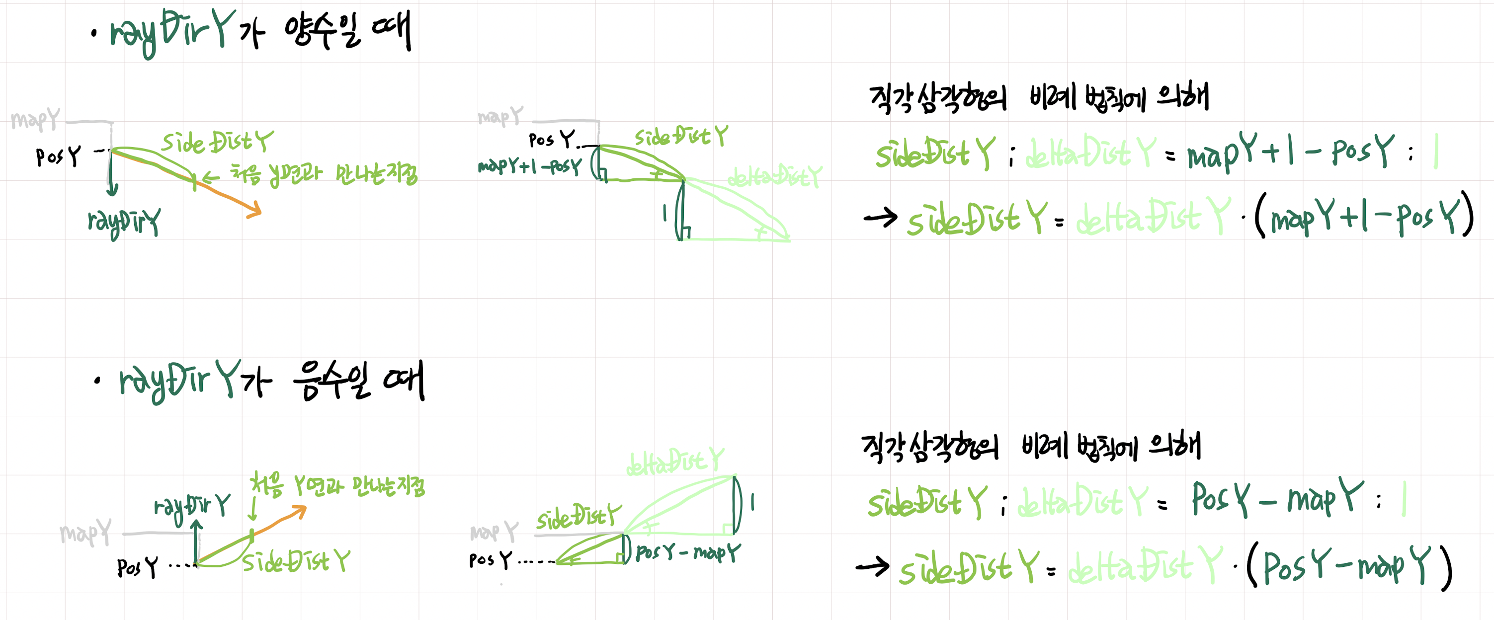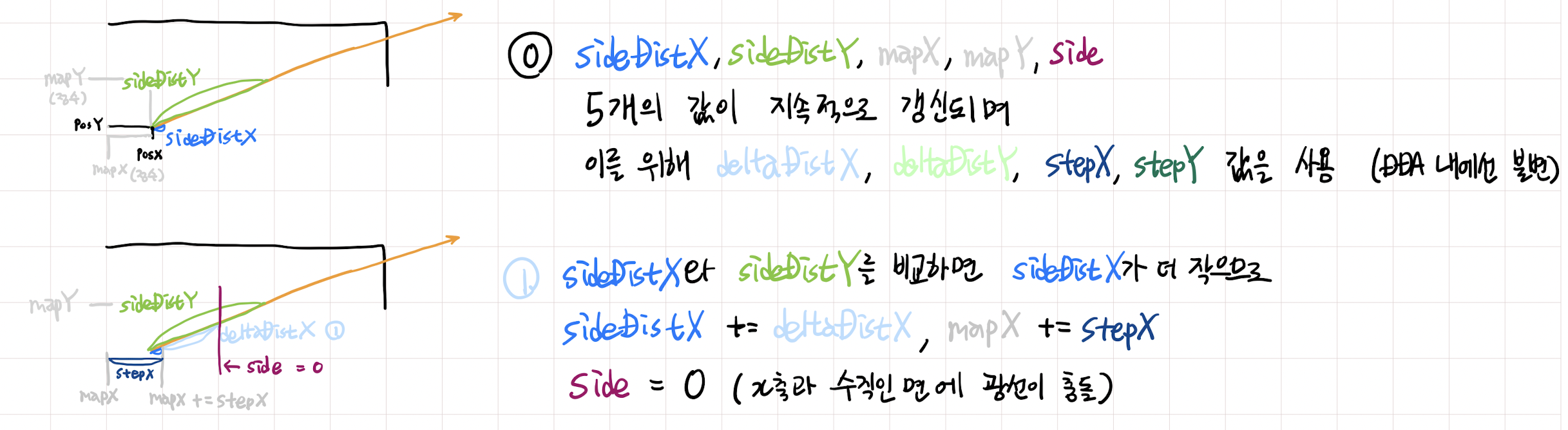 • sideDistX, sideDistY를 계산하며 광선이 어떤 벽에 부딪혔는지 구하는 예시이다