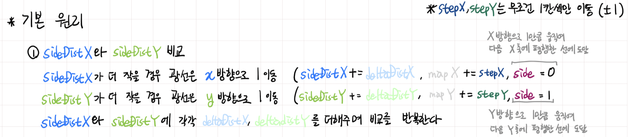 • 기본 원리는 매번 sideDistXsideDistY를 비교하여,
