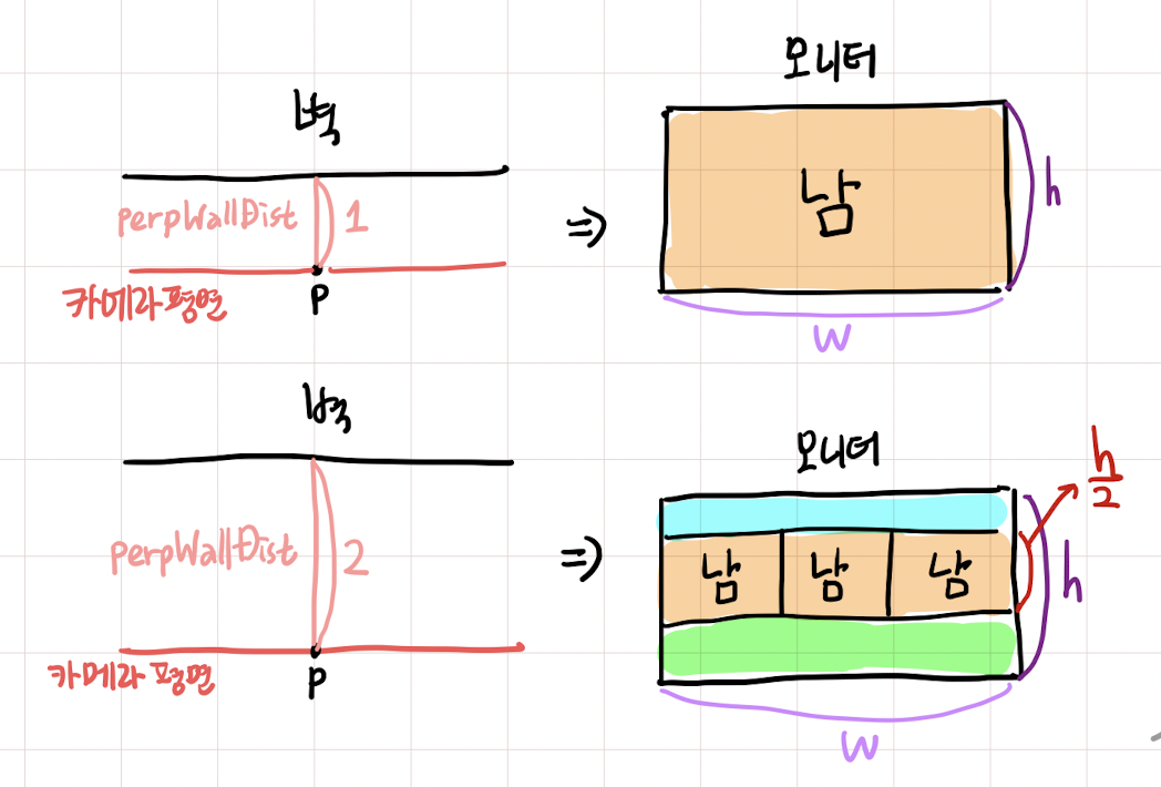 - 카메라 평면부터 벽까지의 거리를 구했으니 이제 벽의 높이를 계산하고, 실제로 화면에 벽을 그릴 단계에 왔다