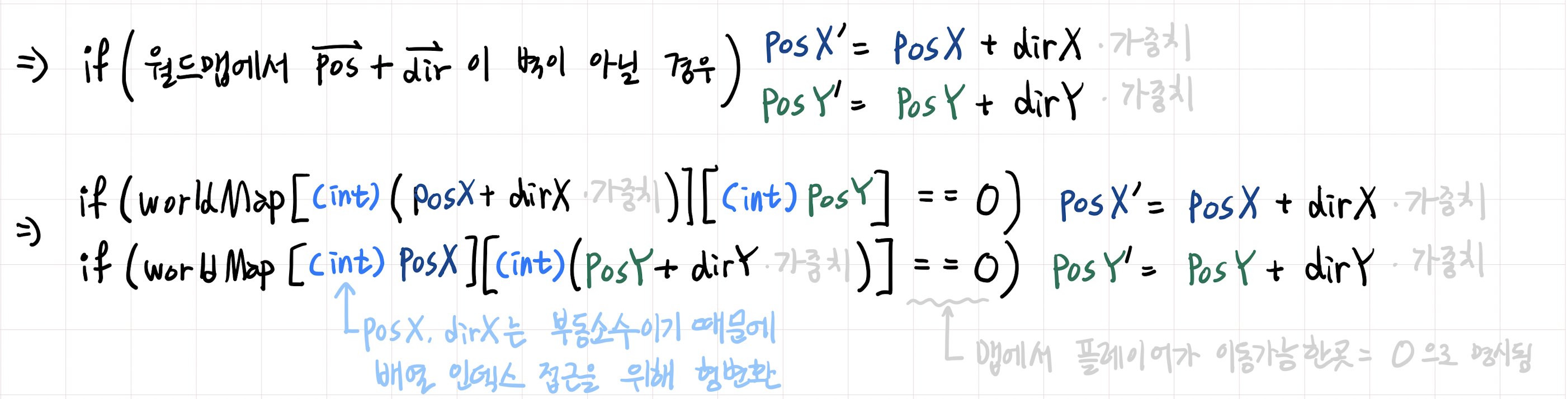 pos에dir(* 가중치) 을 더하거나 (앞으로 이동)pos에dir(* 가중치) 을 빼면 된다 (뒤로 이동)- 가중치는 플레이어의 이동 속도를 조절하고자 할 때 사용한다