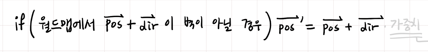 - 단, 벽 충돌 판정 보너스를 구현하고자 한다면 벽이 아닌 곳으로만 이동할 수 있으므로 조건문을 추가하여 이동을 구현한다