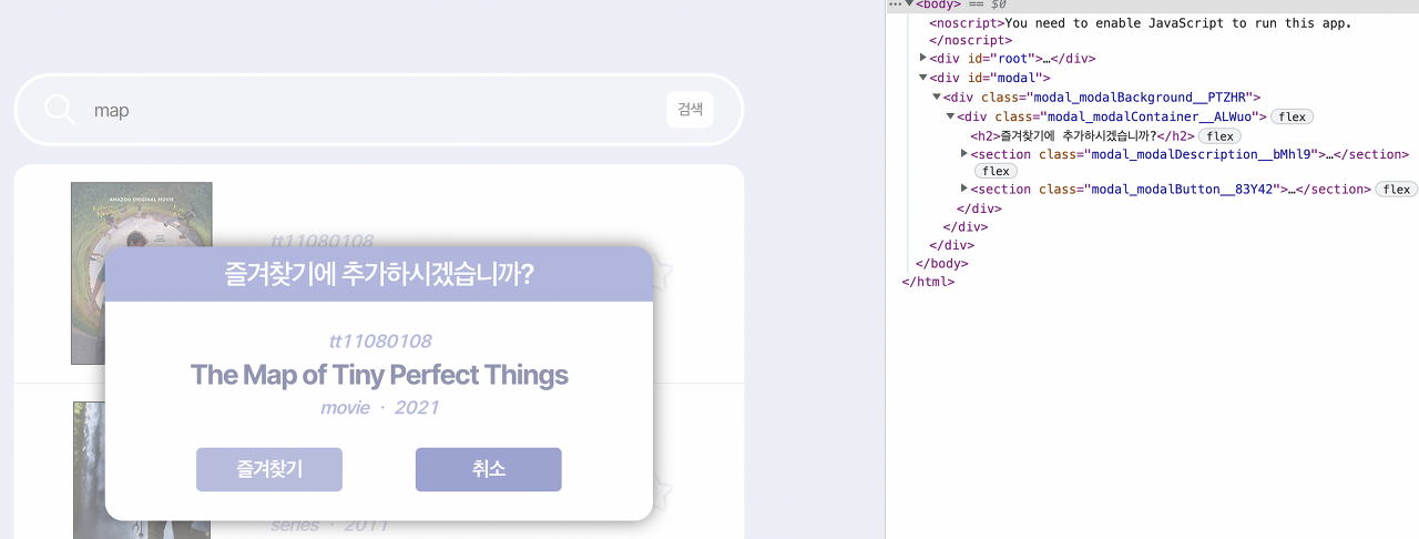 모달을 열었을 때 root div 하위의 modal div에서 모달을 렌더링하는 것을 볼 수 있다