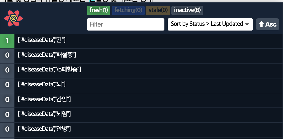searchText가‘간’이라는 문자열일 경우, 이 때 요청된 쿼리는‘diseaseData’와‘간’이라는 두 개의 식별자를 가지며, 이후에searchText가 다시 한번‘간’이라는 값을 가질 때 재요청을 할 지, 같은 식별자를 가진 쿼리 캐시를 가져올지 판단한다