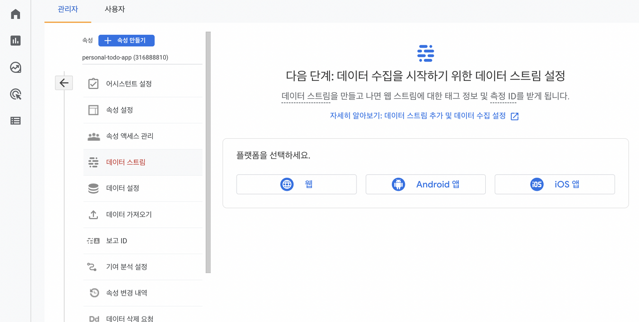 설정 ⇒ 관리자 ⇒ 속성 ⇒ 데이터 스트림 항목에 들어가자