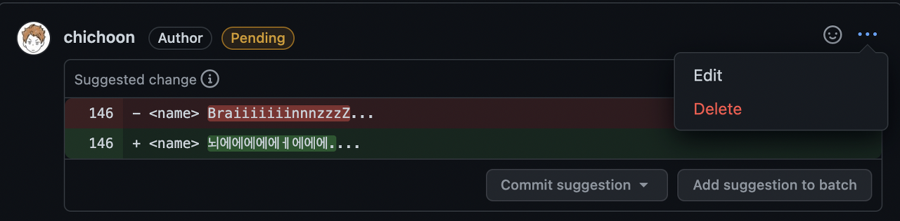 오른쪽 위의 ... 버튼을 눌러 코멘트를 수정하거나 삭제할 수 있다