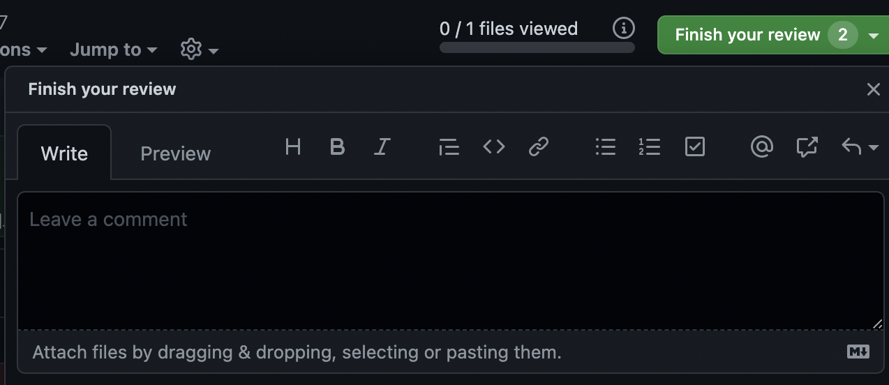 우상단의 Finish your review 버튼을 누르자 (옆의 숫자 2는 지금까지 적은 리뷰 코멘트의 개수이다