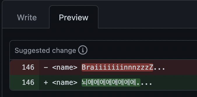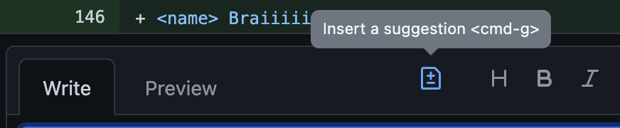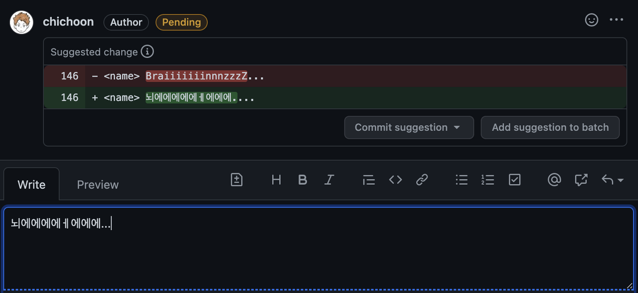 특별히 이 줄은 이렇게 바꾸었으면 좋겠다! 하는 게 있다면 Insert a suggestion 버튼을 누른다