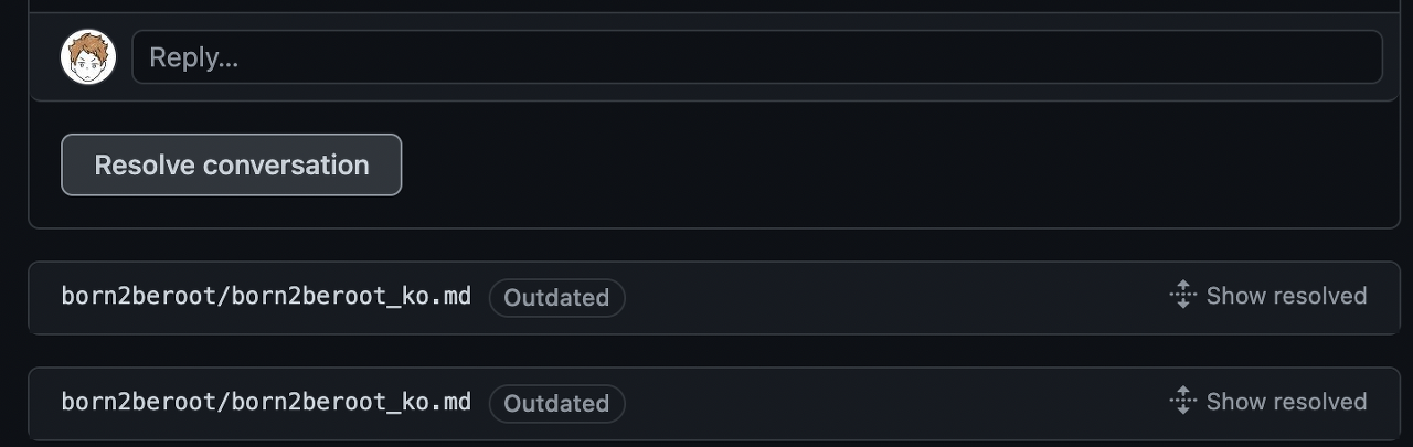 모든 수정사항을 수정하고 풀리퀘스트에 커밋을 추가할 경우, 이전의 리뷰 사항은 Outdated가 된다