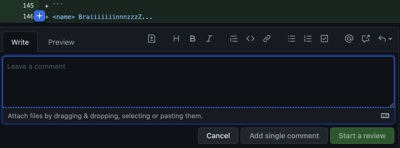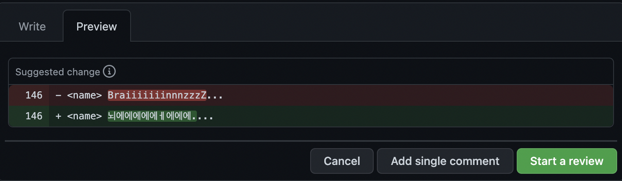 리뷰를 처음 시작했을 때 (리뷰의 첫 번째 코멘트일 때) 는 Start a review 라는 문자열이 표시되고,