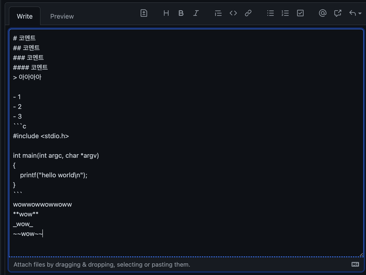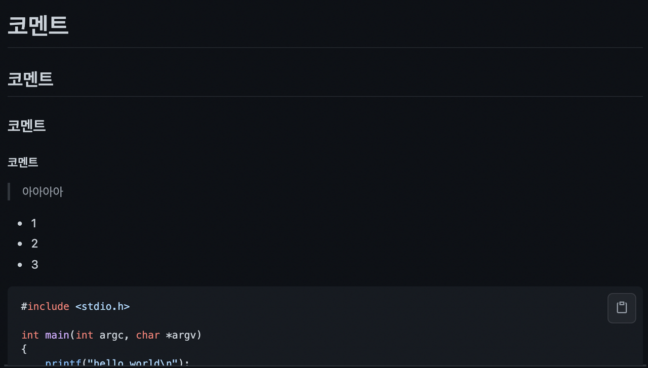 코멘트는 마크다운 문법을 그대로 적용할 수 있어 편리하다 (헤더, 백틱 코드블록, 리스트, 볼드나 이탤릭 등)