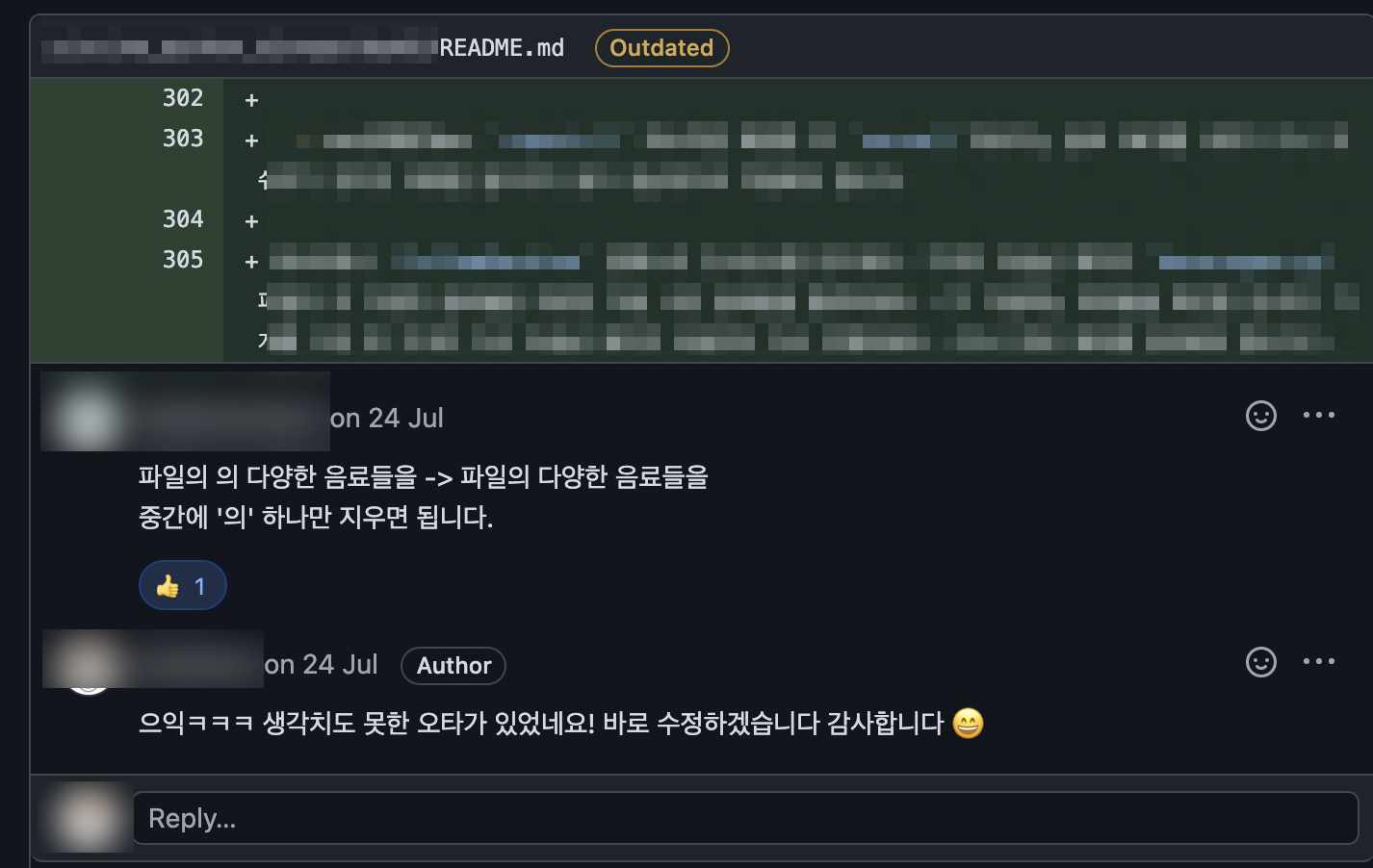 본인의 풀 리퀘스트에서 또는 다른 작성자의 PR 리뷰를 읽어보다가 특별히 코멘트를 달고 싶은 부분이 있다면 해당 리뷰 코멘트에 댓글을 달 수도 있다