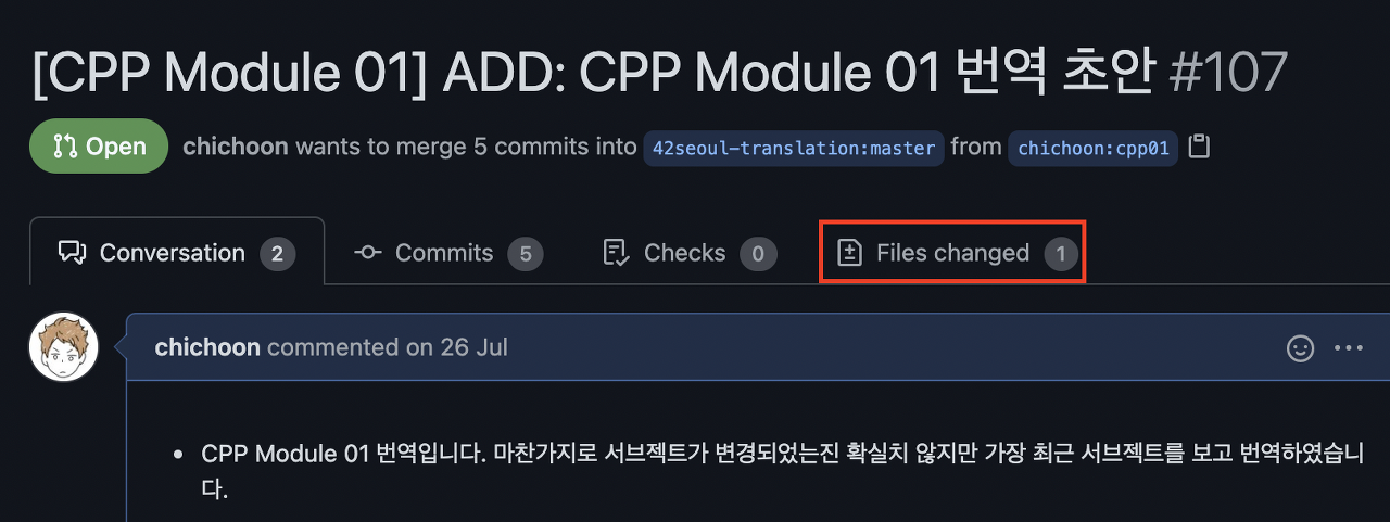 Files Changed를 통해 이 풀 리퀘스트에서 변경된 모든 파일과 수정점을 볼 수 있다