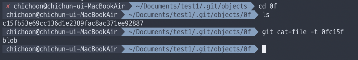 $> git cat-file -t [폴더명][파일명 앞 4자리] # 파일명 다 적어도 상관없음