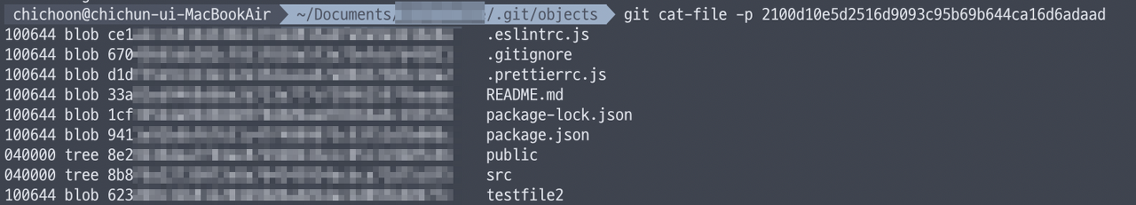 $> git cat-file -p [폴더명][파일명 앞 4자리] # 파일명 다 적어도 상관없음