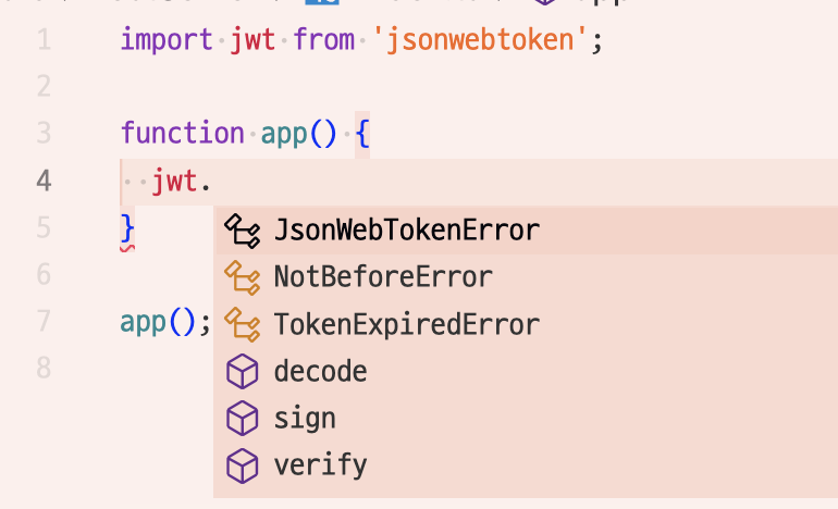 jwt 모듈을 불러와 메서드를 사용하기 위해 점을 찍어보면 decode, sign, verify 그리고 에러 선언 3개 총 6개의 메서드와 프로퍼티가 정의되어 있는 것을 볼 수 있다