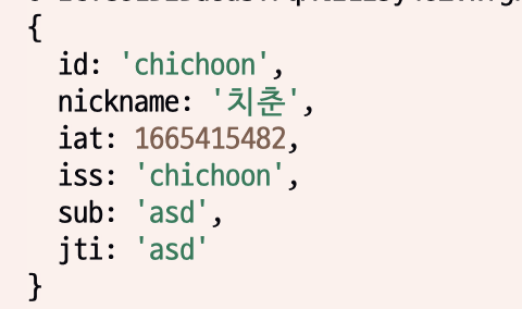 위에 내가 설정한 값 (id, nickname, iss, sub, jti) 과 동일하게 잘 들어간 것을 확인할 수 있다