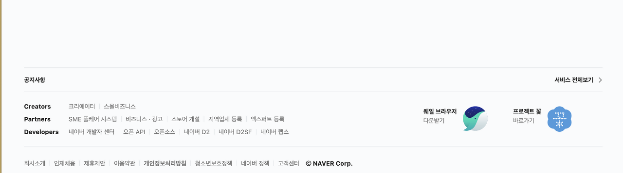 Github의 예시처럼 페이지의 저작권 및 회사와 관련된 문서의 링크를 담거나, 네이버처럼 사이트 내비게이션 링크와 채용 정보 링크 등을 넣기도 한다