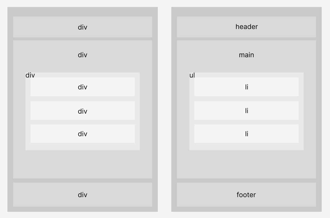 어떤 요소는 왼쪽에 배치되고, 어떤 요소는 오른쪽에 배치될 텐데, 태그만 보고 요소를 짐작할 수 있을까? 물론 클래스나 id, 리액트에서의 컴포넌트명 등을 보면 구분이 가능하겠지만, html 태그만으로는 파악이 힘들어진다