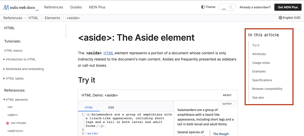위의 MDN 공식 문서 페이지에서는 aside 페이지의 목차를 담고 있다