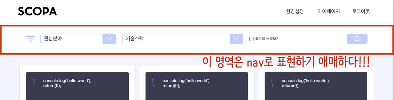 위의 예시에서 SCOPA (이 프로젝트의 이름 = 웹 사이트의 이름) 는 h1, 유저의 닉네임 (earlybird) 은 h2, 해당 유저의 프로필 관련 요소 제목 (# 저는 이런 분야에~, # 저는 이런 요구사항이~) 은 h3으로 표현하였다