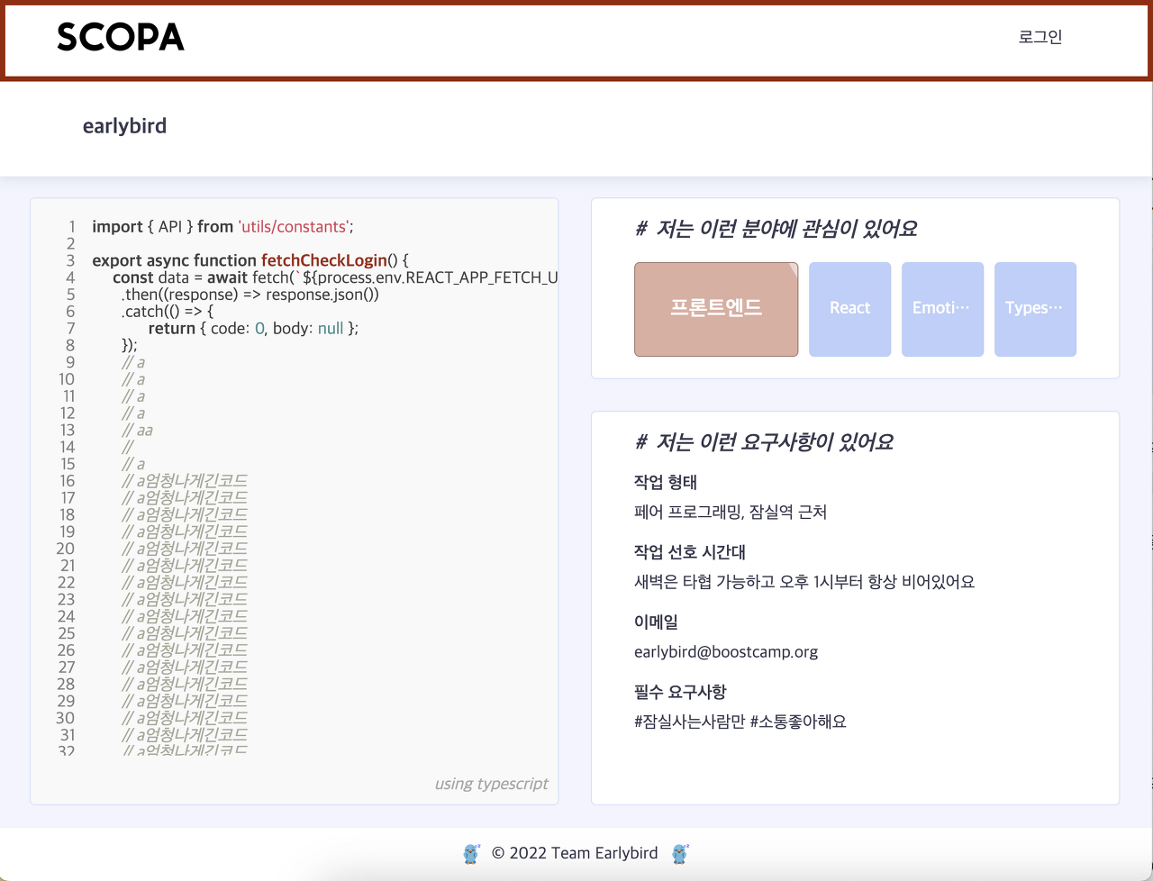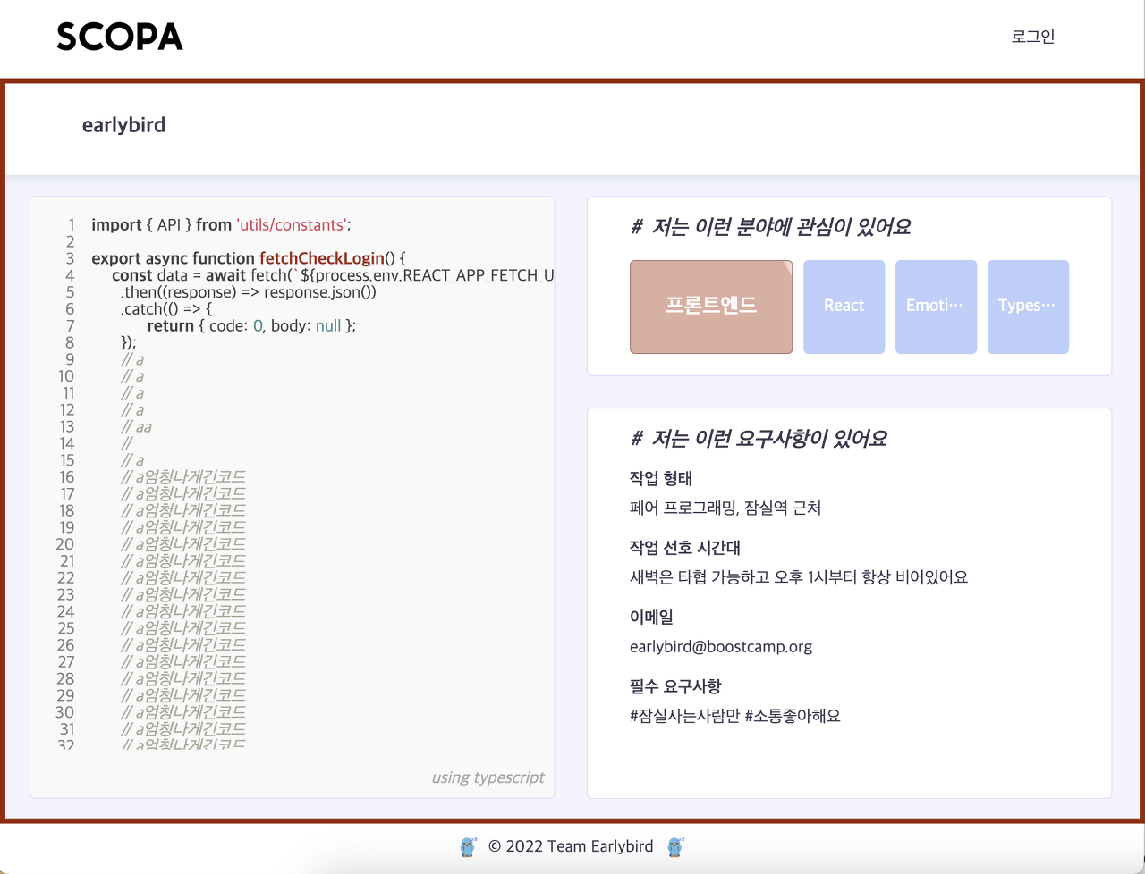 <p>SCOPA는 코드를 통해 소통하고 팀원을 구할 수 있는 웹 서비스이다</p>