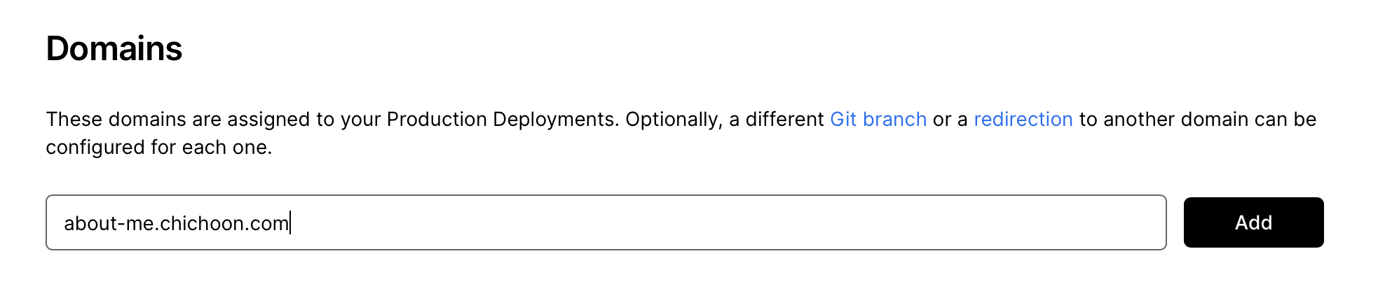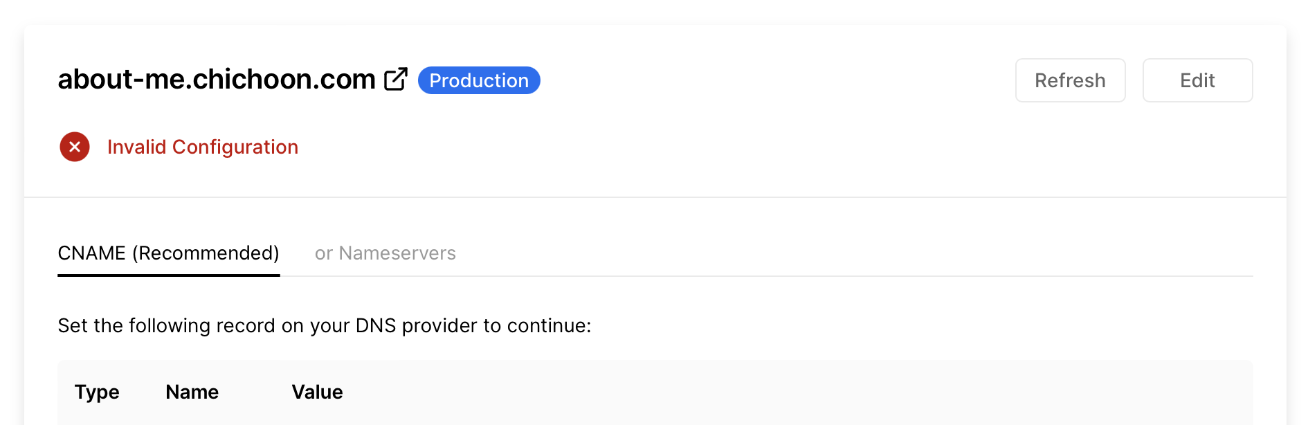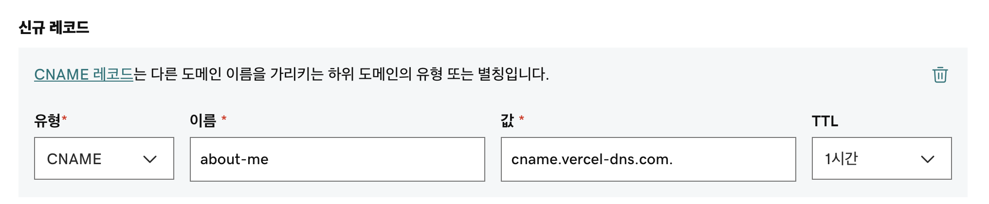 아까 설정한 도메인 (about-me.chichoon.com 이었으므로 about-me) 을 입력하고, 값에는 Vercel 에서 알려준 값을 붙여넣기한다
