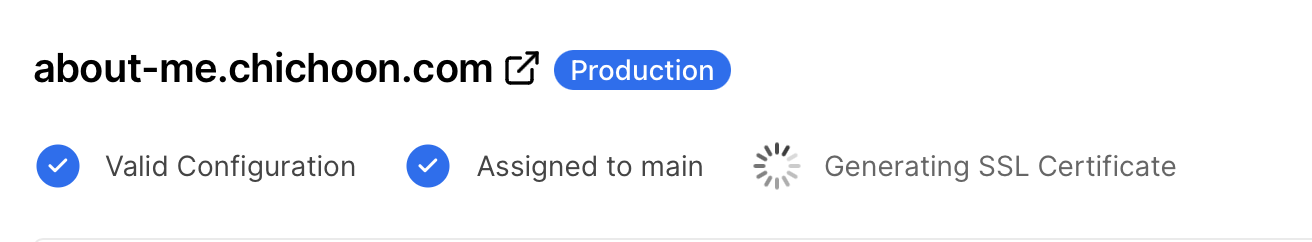 CNAME 을 통해 도메인을 잘 연결했다면 아까와 달리 Valid Configuration 이 파랗게 나올 것이다
