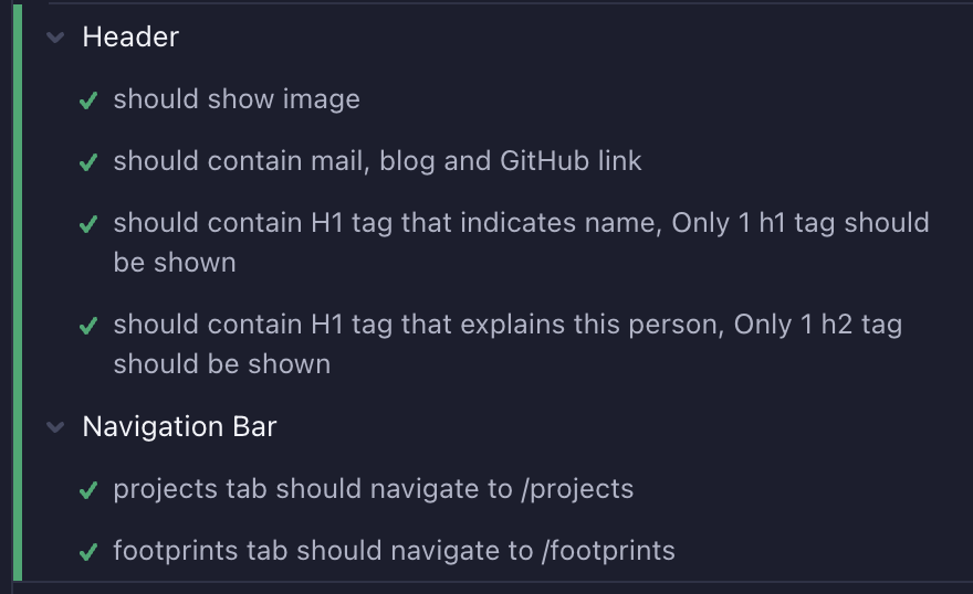 각각의 체크 표시는 it의 콜백 함수에 작성한 테스트들을 의미하며, 통과하면 체크, 오류가 발생하면 빨간 경고 창이 나온다