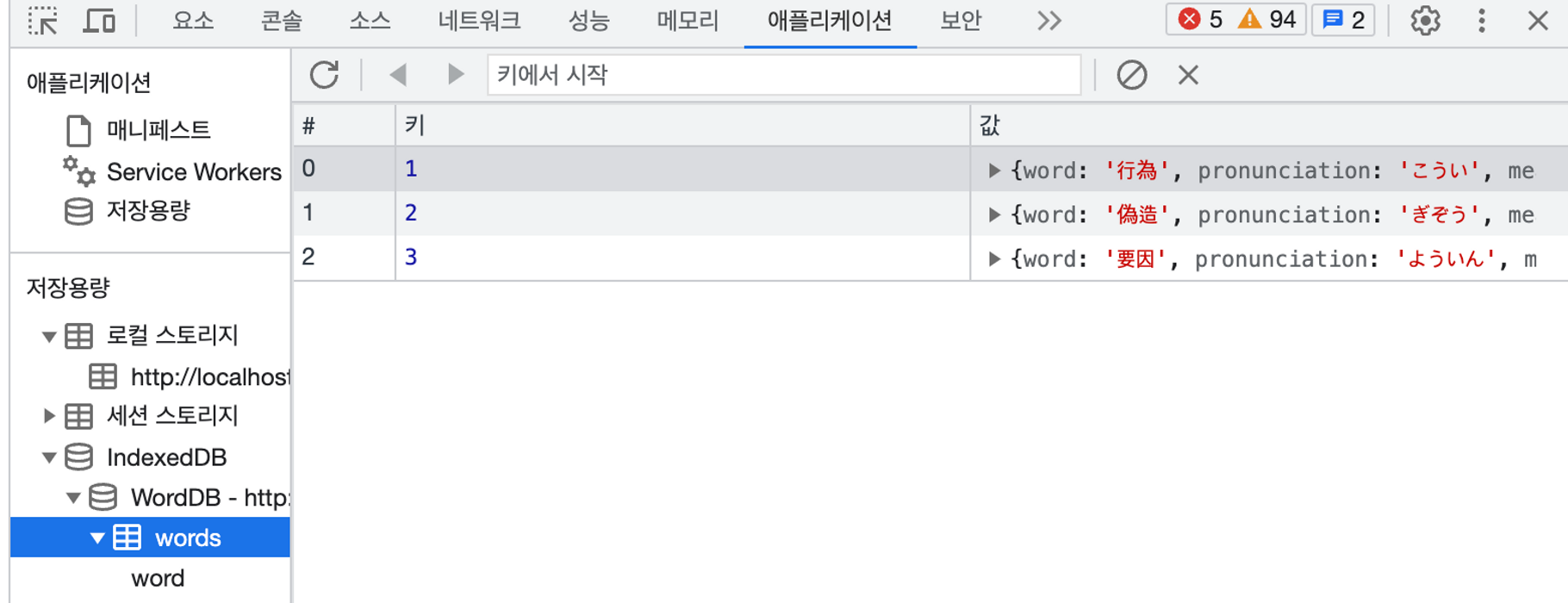 - 로컬 스토리지는 10메가정도밖에 담을 수 없기 때문에 (그래도 어림잡아 400만개 단어를 저장할 수 있긴 하다) IOS 기준 500메가 이상으로 더 넉넉한 indexedDB를 이용해보기로 했다
