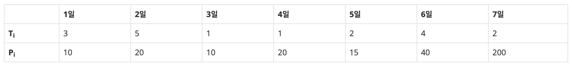 각각의 상담은 상담을 완료하는데 걸리는 기간 Ti와 상담을 했을 때 받을 수 있는 금액 Pi로 이루어져 있다.