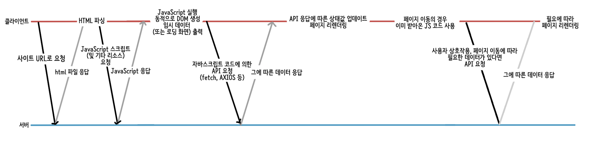 - 페이지를 이동할 경우, 이미 이전에 받아둔 자바스크립트를 통해 렌더링하며, 추가적인 데이터가 필요할 때만 서버에 요청을 보낸다