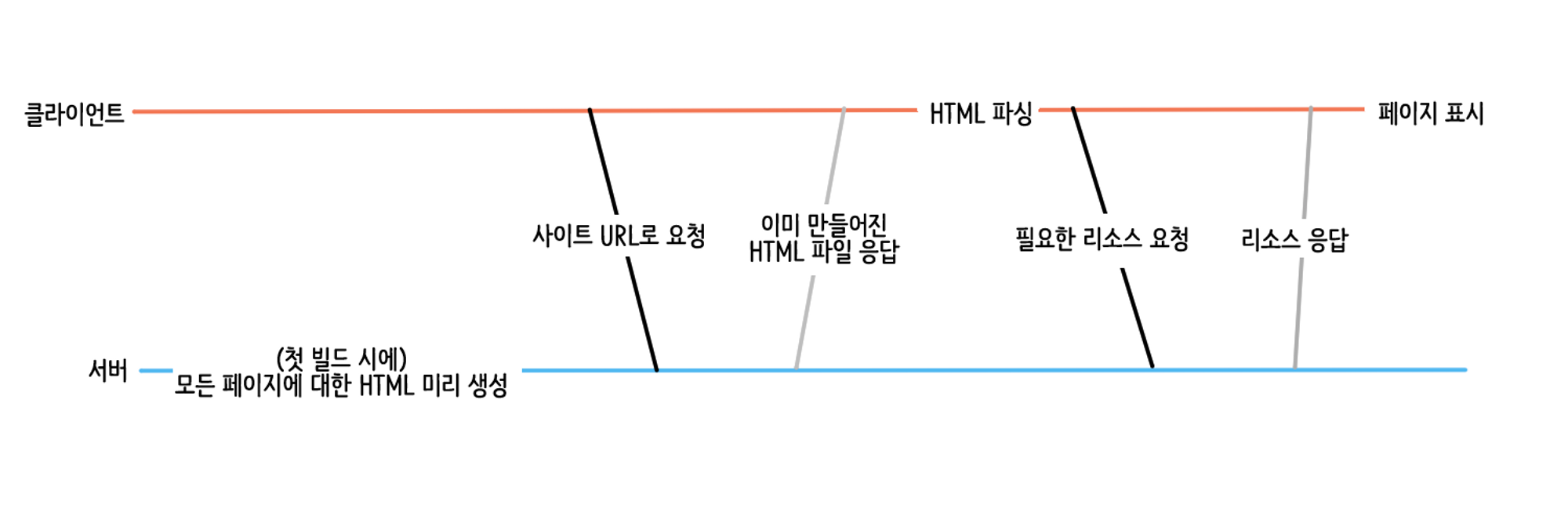 - 서버는 빌드 타임에 모든 페이지에 대한 html 파일을 생성해 둔다