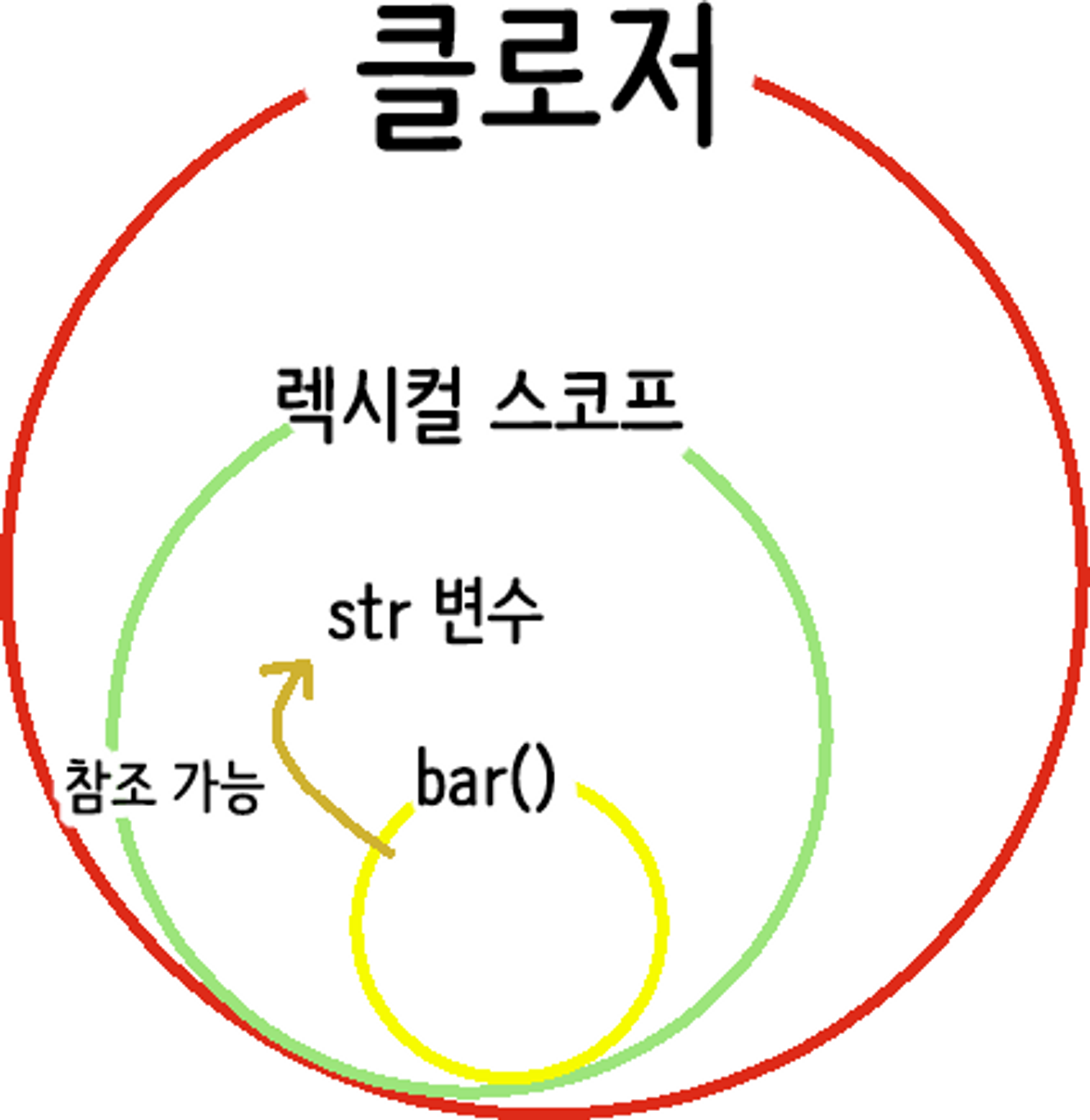 여기서 우리가 bar 함수를 반환받아 실행시킨다면, str은 foo의 스코프 안에 있으니 foo가 종료된 (값을 반환한) 시점에선 존재하지 않는 변수라고 생각할 수 있다