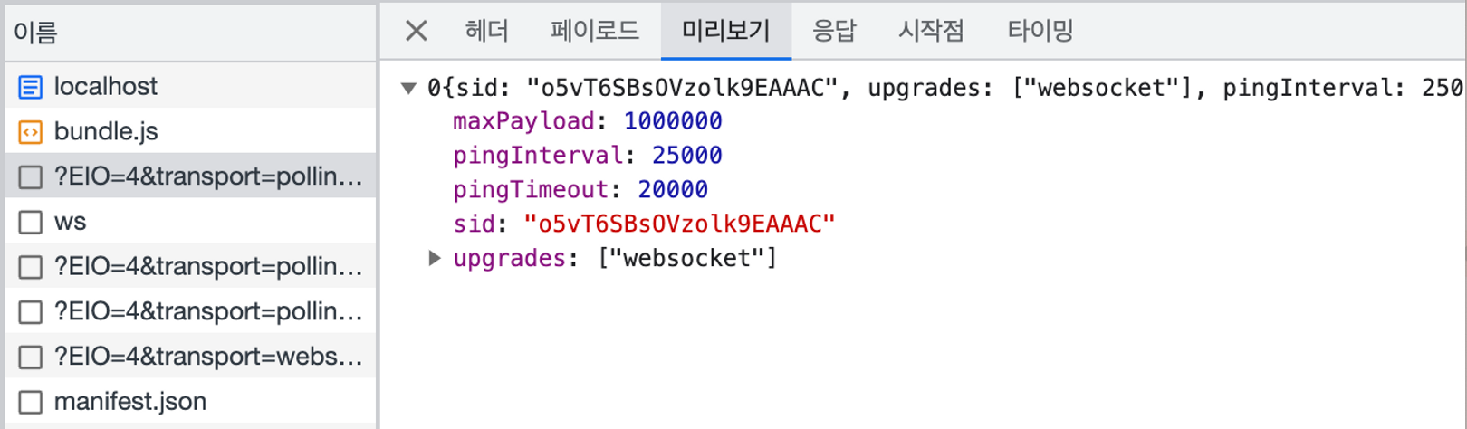 upgrades는 서버가 지원하는 ‘더 나은’ 전송 기법이 담기며, 여기서는 웹소켓으로 연결을 추천하기 때문에websocket이 들어갔다pingInterval과pingTimeout은 heartbeat 매커니즘에 사용된다고 한다