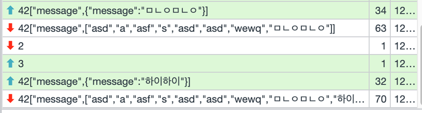 그렇다는 것은, 42[”message”…] 는 메시지 + EVENT, 반복적으로 나타나는 2와 3은 브라우저와 서버간 핑퐁임을 알 수 있다