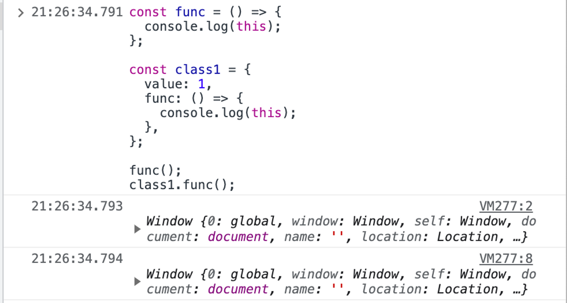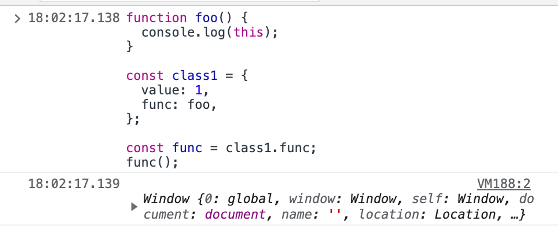 단순 호출 시에는 호출된 시점에서의 부모 객체를 참조하므로, 위에서 foo가 호출되었을 때의 부모 객체인 Window (또는 global) 객체가 출력된다