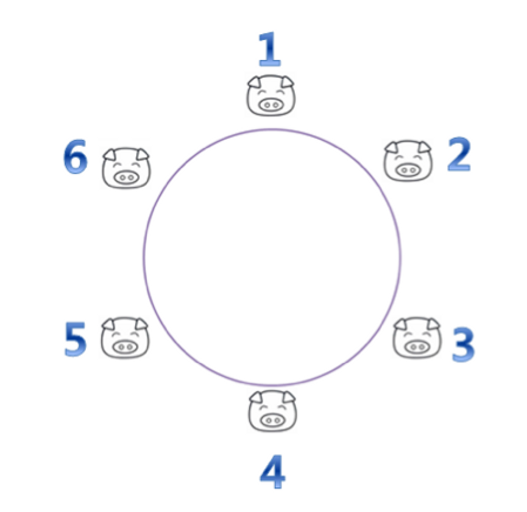 돼지는 원형 식탁에 앉아서 식사를 한다. 현수의 돼지들은 기억력이 뛰어나기 때문에 전 날 자신의 양쪽과 맞은편에 앉았던 돼지가 먹었던 양을 기억하고 있다. 또, 욕심도 많기 때문에, 그 만큼의 양을 추가하여 식사를 하기를 원한다.