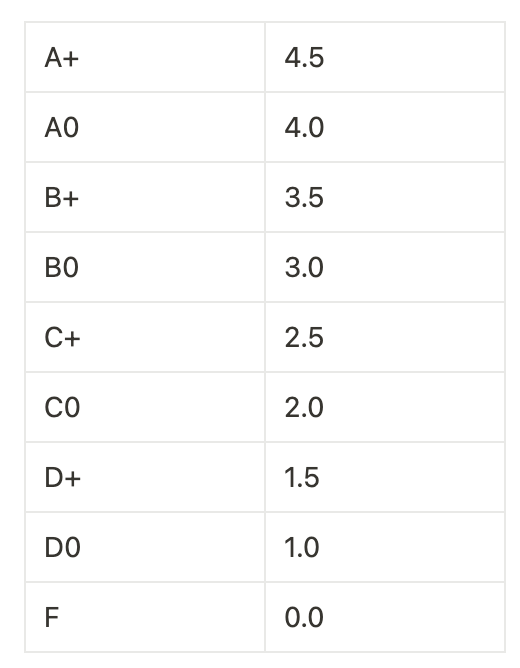 P/F 과목의 경우 등급이 P또는 F로 표시되는데, 등급이 P인 과목은 계산에서 제외해야 한다.