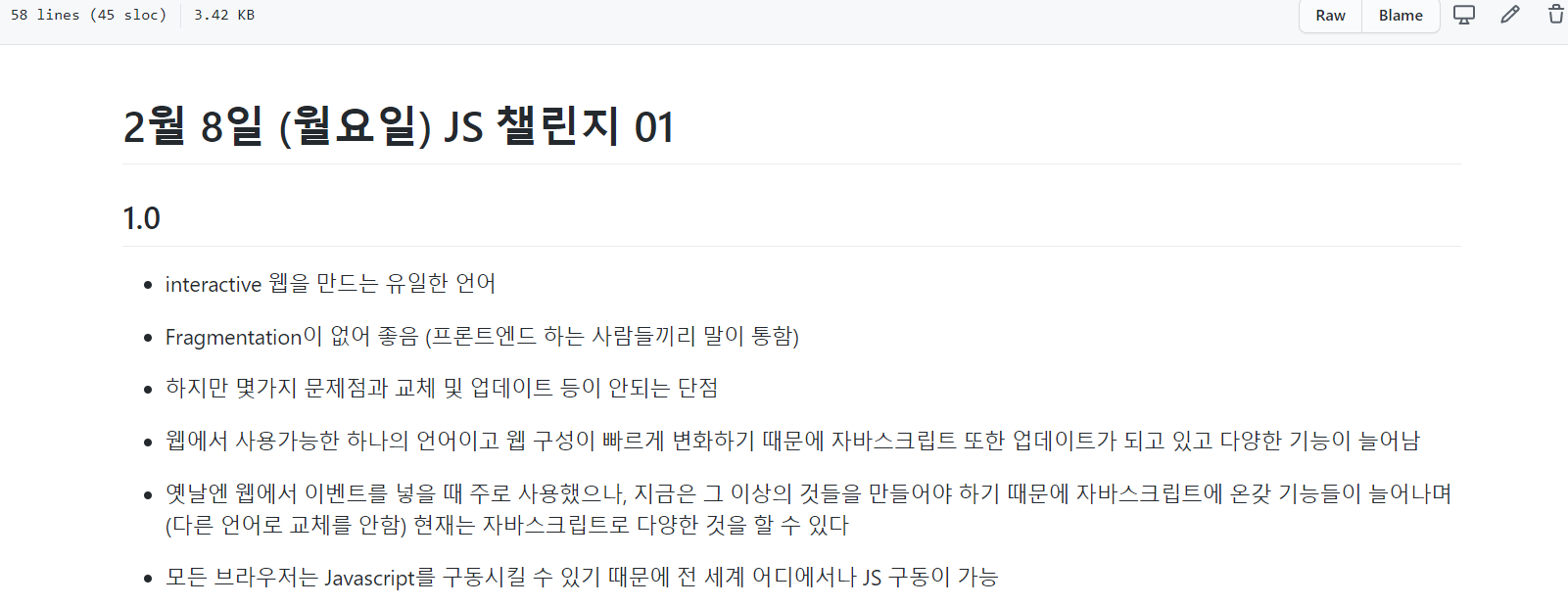 2월 8일자는 거의 이론 위주 (js를 배워야 하는 이유 등..) 라 마크다운이 더 길었다